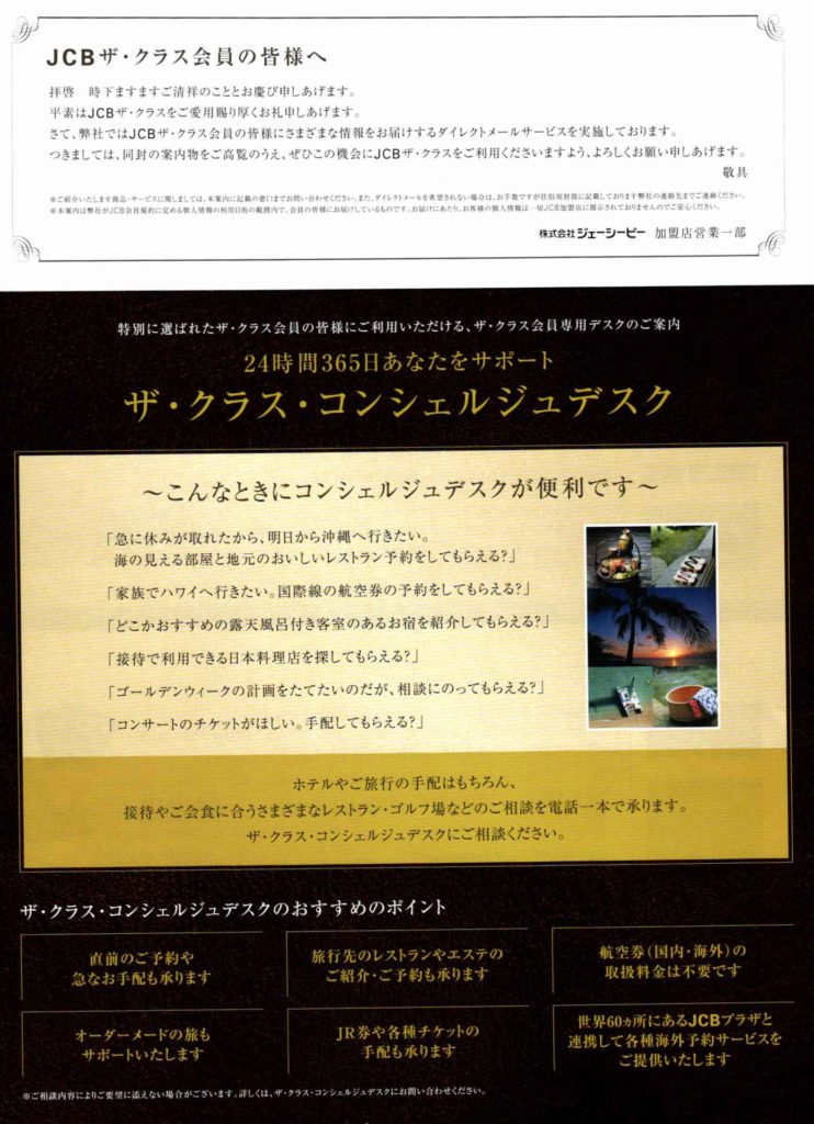 JCB:JCBザ・クラス会員へのDM drak 13年前 目次 JCB THE CLASS 【石垣島ロングバカンス】と【アイランドクルーズ】 JCB THE CLASS JCBトラベル関係のDMが届きました。 普段はこういったDMにはあまり眼を通すことはないのですが,ちょうどGWと夏休みの旅行計画案を練っていた時だったので参考までにとそのパンフを読んでみました. 【石垣島ロングバカンス】と【アイランドクルーズ】 どちらのコースも,私の短い休み期間では到底十分に楽しめそうにもありません^^; クラスのコンシェルジュ経由の申し込みだと5,000円分割引されるようですが・・・^^;